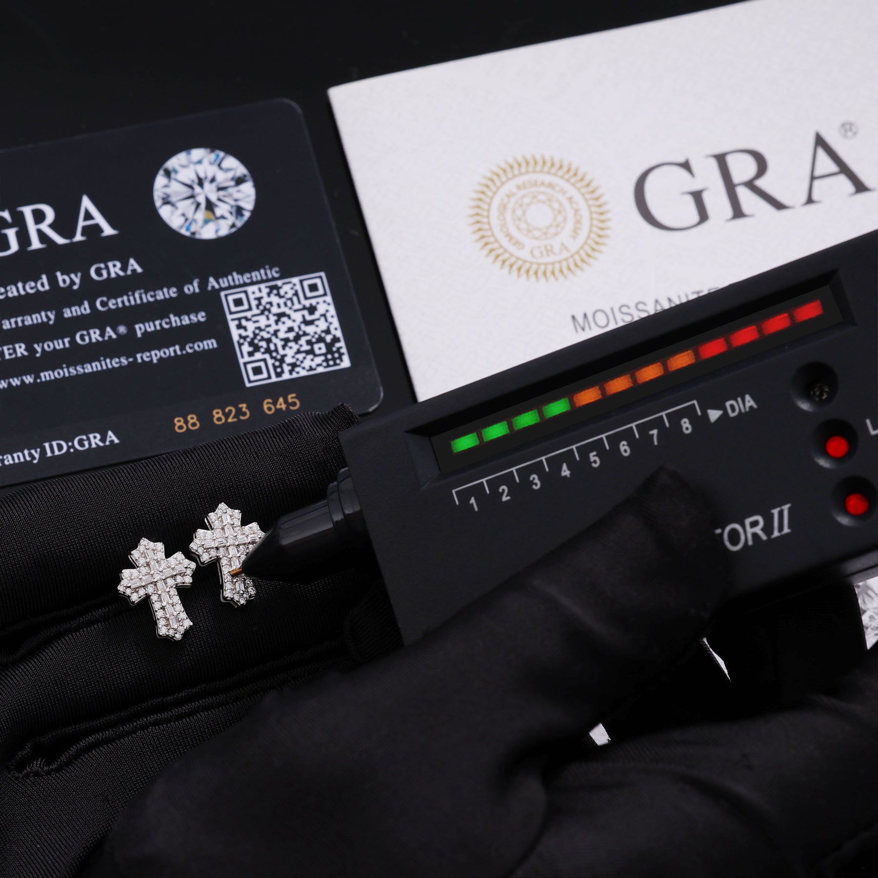 Designed for guys who appreciate quality without the pretense, these VVS Moissanite Baguette Cross Earrings deliver real substance. The baguette-cut stones are engineered for maximum light performance. They pass any diamond tester and hold their own in any setting. Anchored in 925 sterling silver for durability and backed by GRA certification, you're getting authenticity you can trust. The cross silhouette reads clean and intentional, adding dimension to your look without demanding attention. A versatile piece that works solo or layered, built to become part of your everyday rotation.
