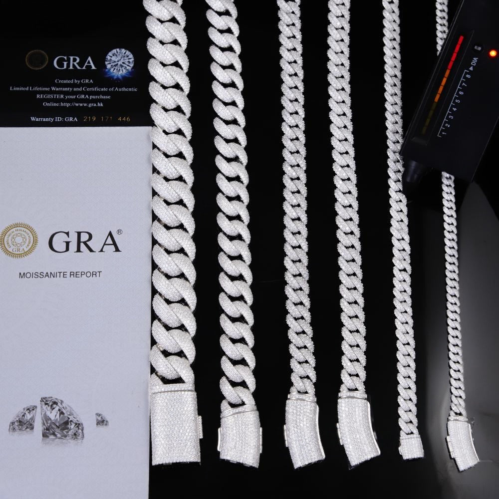 Elevate your style with this VVS Moissanite Iced Out Cuban Link chain, crafted from durable 925 silver. Available in 6mm, 9mm, and 13mm widths, it’s designed to catch eyes and pass diamond testers with its certified brilliance. Perfect for adding a bold, strong edge to any pendant, this chain shines with unmatched clarity and personality.